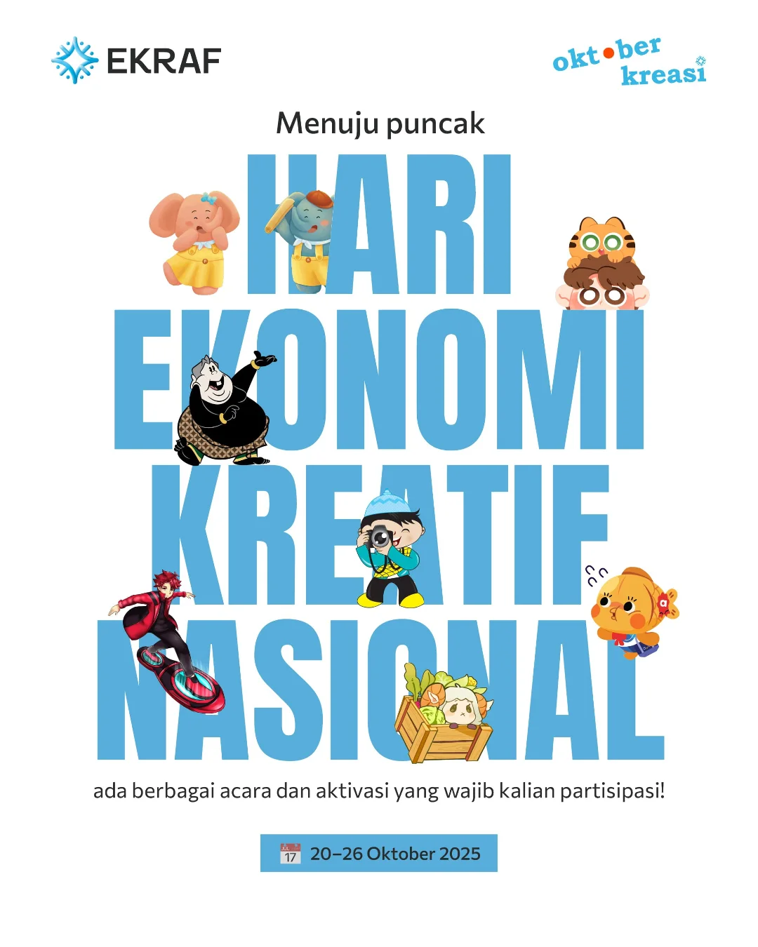 Di Yogyakarta, Jogja Ekraf Week 2025 akan menjadi salah satu pusat perayaan. Digelar di Sleman City Hall pada 24–26 Oktober, acara ini memadukan pameran karya seni, lomba mural dan fotografi, pertunjukan busana lokal, serta diskusi seputar peluang ekonomi kreatif bagi generasi muda. Sementara di Jakarta, Indonesia Comic Con & Indonesia Anime Con 2025 yang berlangsung pada 25–26 Oktober di JIExpo Kemayoran menegaskan posisi kuat subsektor budaya pop sebagai bagian penting dari ekraf nasional.