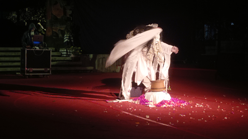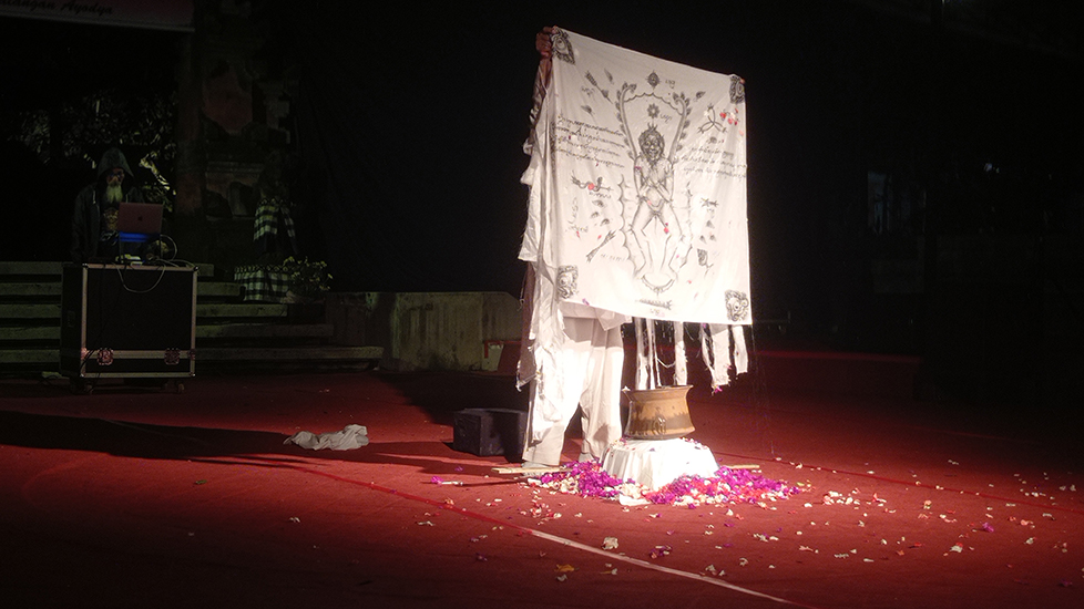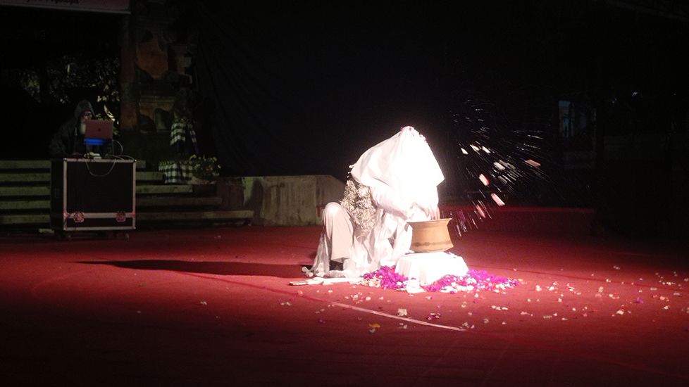 Ketika suara itu selesai, tubuh muncul dalam posisi duduk. Diam. Rendah. Hampir seperti titik kecil di tengah panggung yang luas. Kepala penari sepenuhnya tertutup kain bergambar rajah. Pada kain itu tergambar sosok dewa di pusat, dikelilingi aksara dan sembilan senjata Dewata Nawa Sanga yang menjaga sembilan penjuru mata angin. Simbol kosmos menutupi wajah. Pusat semesta menjadi topeng. Di depannya sebuah periuk tanah berisi air dan kembang bertengger di atas level kecil berselimut kain putih yang dikelilingi taburan kelopak bunga tiga warna.