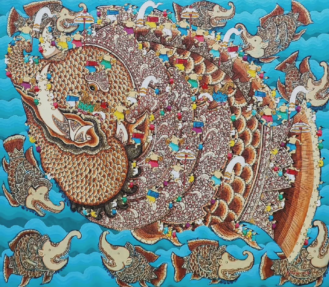 Dalam karya terbarunya yang berjudul “Makara” (2025), perupa Bali Made Gunawan (sebagaimana biasanya) menghadirkan dunia fantasi ritual yang padat, riuh, dan penuh kehidupan. Pada permukaan kanvas, kita melihat seekor makara raksasa, makhluk mitologis yang kerap muncul dalam ikonografi Hindu-Bali, melintas di tengah gelombang biru yang berlapis-lapis. Tubuhnya tidak hanya dibentuk oleh sisik dan ornamen, tetapi juga oleh ratusan figur manusia mini yang menjadi ciri khas Gunawan: berwarna-warni, ceria, seolah merayakan keberadaan sang makhluk air.