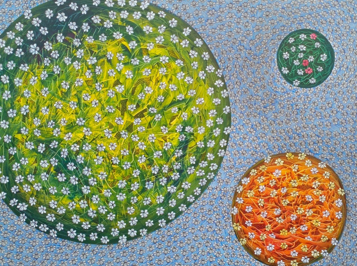 Dalam lukisan acrylic di atas kanvas berdimensi 150 × 200 cm ini, tiga planet muncul dalam warna dan suasana berbeda. Planet hijau-kuning yang paling besar dapat dipahami sebagai citra bumi yang masih menyimpan harapan: hijau untuk kehidupan, kuning untuk energi, dan keduanya berpadu menjadi lanskap yang subur namun padat. Planet oranye menunjukkan intensitas yang lebih ekstrem yakni warna panas, warna tanah yang retak, warna dunia yang sedang dihadapkan pada suhu yang makin meningkat. Sementara planet kecil berwarna hijau tua, dengan beberapa bunga merah muda, tampak seperti oasis, ruang yang masih bertahan di tengah tekanan ekologi global.