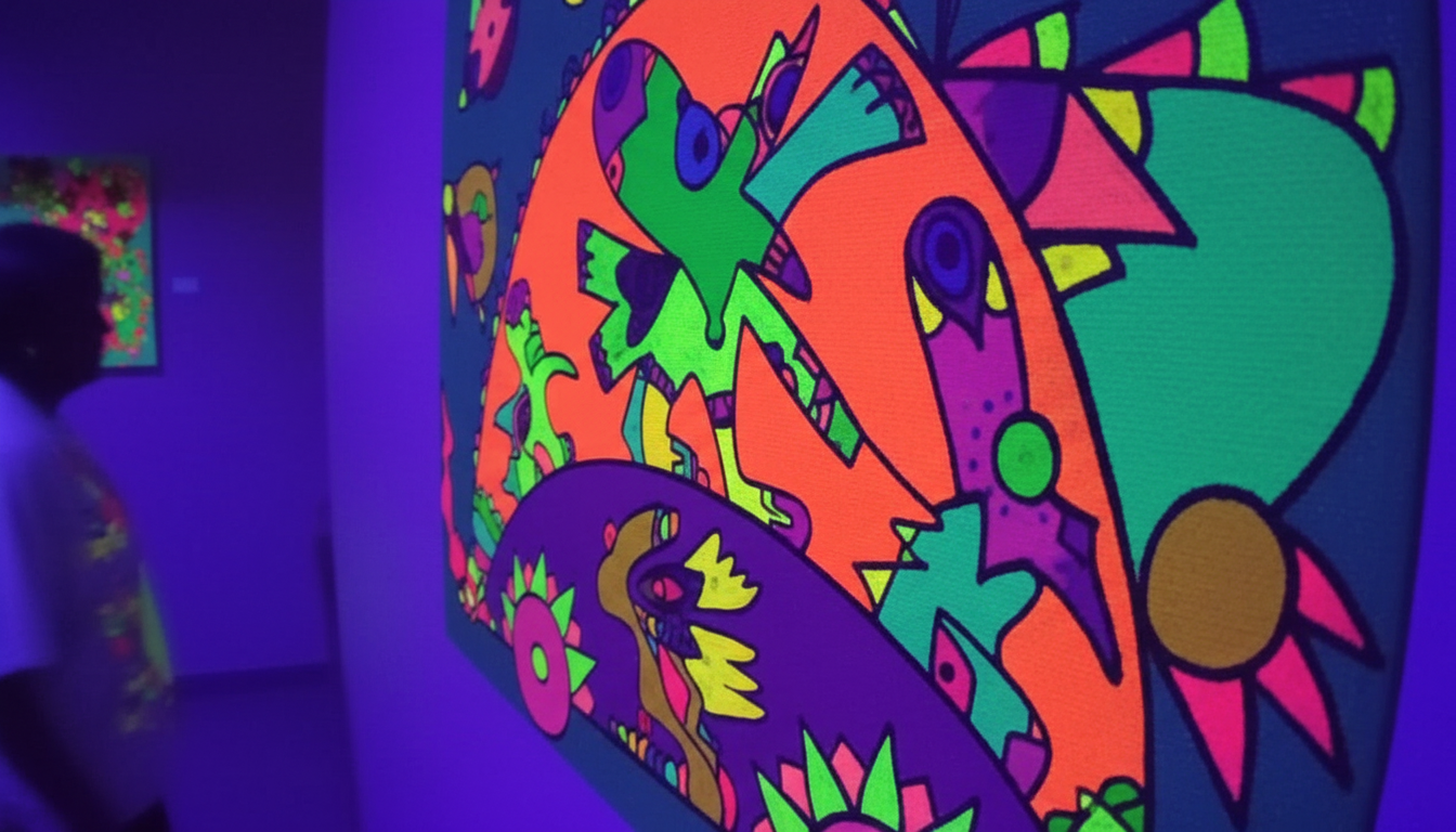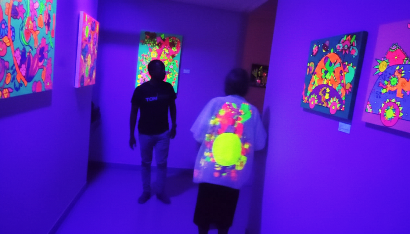 Dinding ruang pamer itu seketika tampak penuhi figur-figur menyala. Para pengunjung yang berdiri di depannya terlihat hanya sebagai siluet. Sosok-sosok itu memberi kontras yang kuat pada lukisan-lukisan yang menyala itu. Tidak ada trik kamera. Warna-warna fluoresen di kanvas merespons sinar UV dengan cara yang nyaris magis.